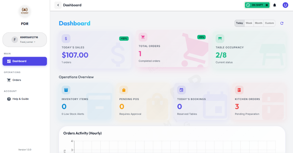 A green ON SHIFT indicator confirms they are ready to serve tables.